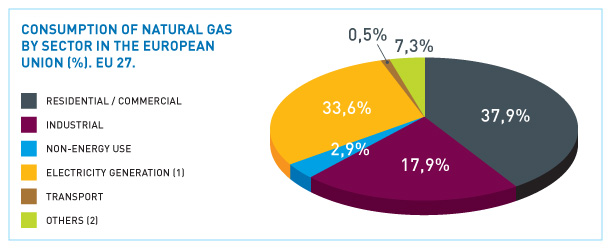 Within the European Union, close to 37% of natural gas consumption is channelled towards the residential-commercial market. Electricity generation (including cogeneration) consumes around a third of the total, situating the industrial market in third place with 18%, this last amount in continual decline.