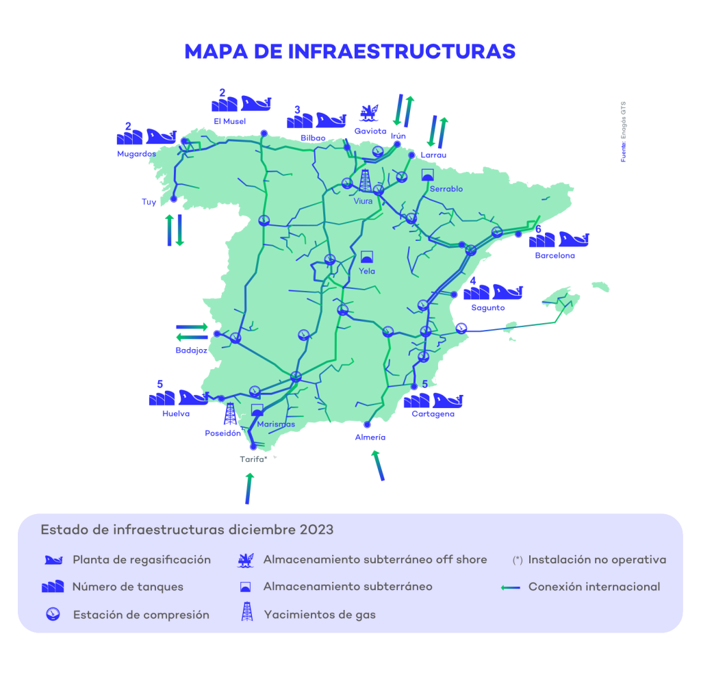 El Sistema Gasista español se ha mantenido en 2023 con las mismas infraestructuras que el año Precedente: contaba con 11.369 kilómetros de gasoductos de transporte primario a finales de 2023 (un total de 13.361 kilómetros si se incluyen los secundarios).La red de gasoductos cuenta también con 19 estaciones de compresión, así como centros de transporte, estaciones de regulación y medida y puntos de conexión a la red. Estas instalaciones permiten la correcta distribución primaria de gas por el territorio nacional, así como disponer de seguridad de suministro de gas natural, incluso en situaciones de puntas de demanda.